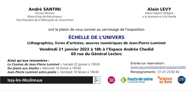 Le Cosmos & Echelles d’univers: Expositions/Conférences art & science de notre ami et membre du CS de PSA : Jean-Pierre Luminet, poète et astrophysicien.