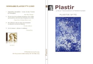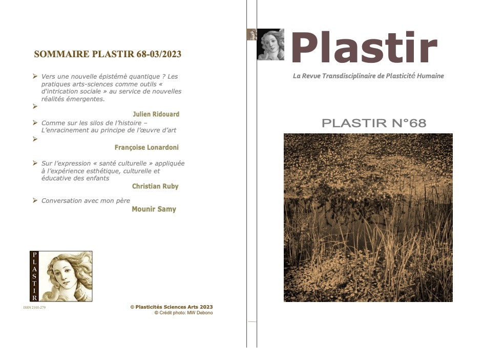 FONCTIONNEMENT DE LA REVUE : Les articles publiés sont parrainés, c’est à dire sollicités par PSA au sein de ses membres ou de personnalités invitées. Cependant, la revue accepte également des propositions de textes qui seront soumis à un comité de lecture constitué par le bureau de PSA. Les textes publiés dans PLASTIR ont, pour certains, des copyrights auteurs, et sont la propriété de PSA Editeur qui pourra les publier sous forme d’ouvrages papier. Ils engagent la seule responsabilité de leurs auteurs et ne peuvent en aucun cas être reproduits ou utilisés sans l’autorisation écrite préalable du président de l’association et rédacteur en chef de la revue, sous peine de poursuites judiciaires pour entrave au droit d’auteur. Cela concerne autant les articles papier publiés au sein de numéros hors-série de la revue sous forme de livre que les e-books de la collection Plasticités. La référence ISSN du journal déposée à la BNF et l’utilisation de la nomenclature internationale OAI liée à la publication des e-revues garantit les droits de citation, de republication sous différentes formes et de référencement des essais publiés.
